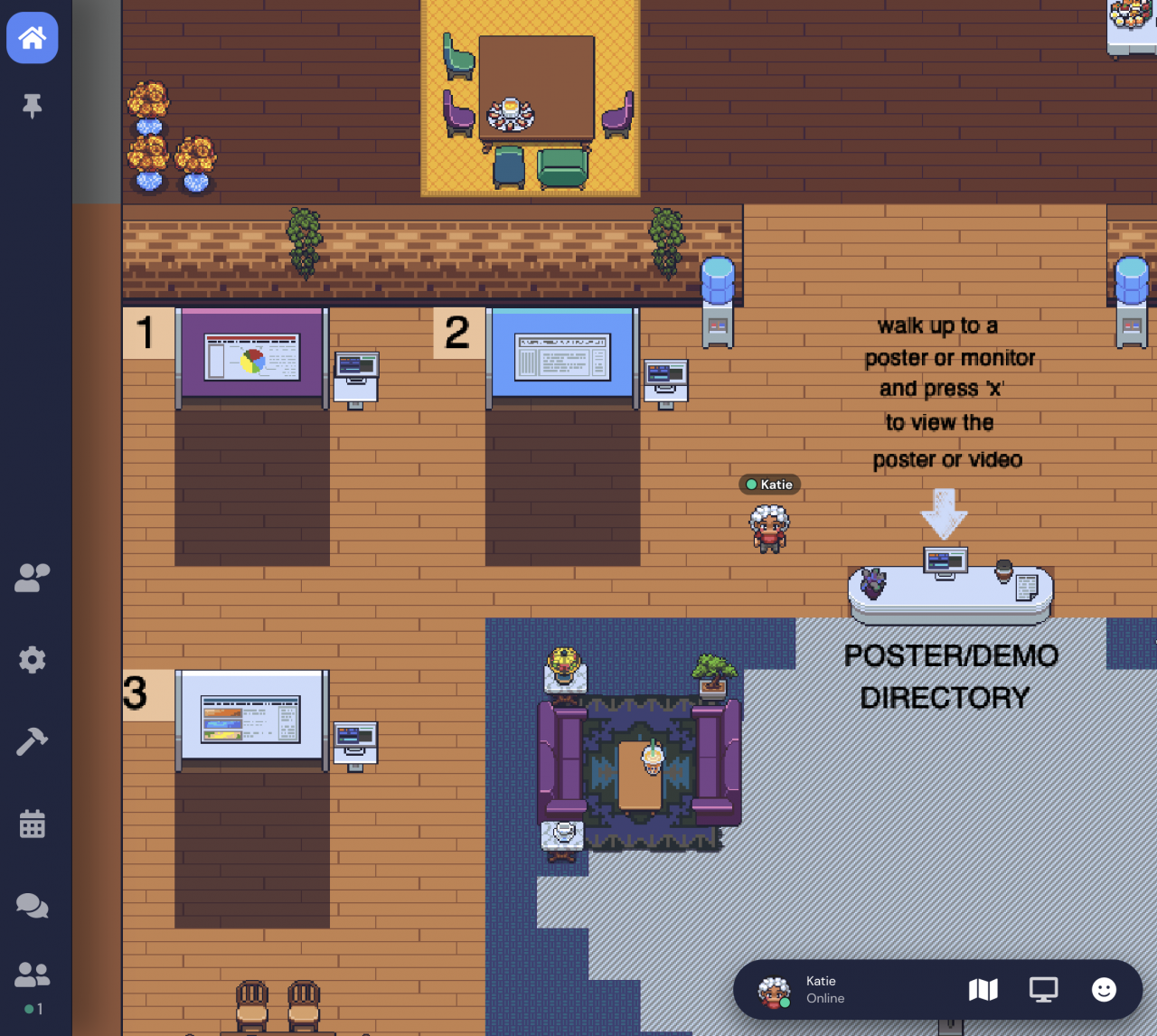 Gather is a 2D world with 8-bit graphics. Participants move their avatar around the symposium space using their keyboard’s arrow keys. The poster and demo materials will be pre-loaded onto virtual poster stands. To interact with the materials, symposium attendees will "walk" up to the poster stand and press the “x” key to enter a full screen viewing. The presenter and attendees will be able to interact while the attendee is viewing the materials. An example poster room looks like this: